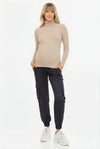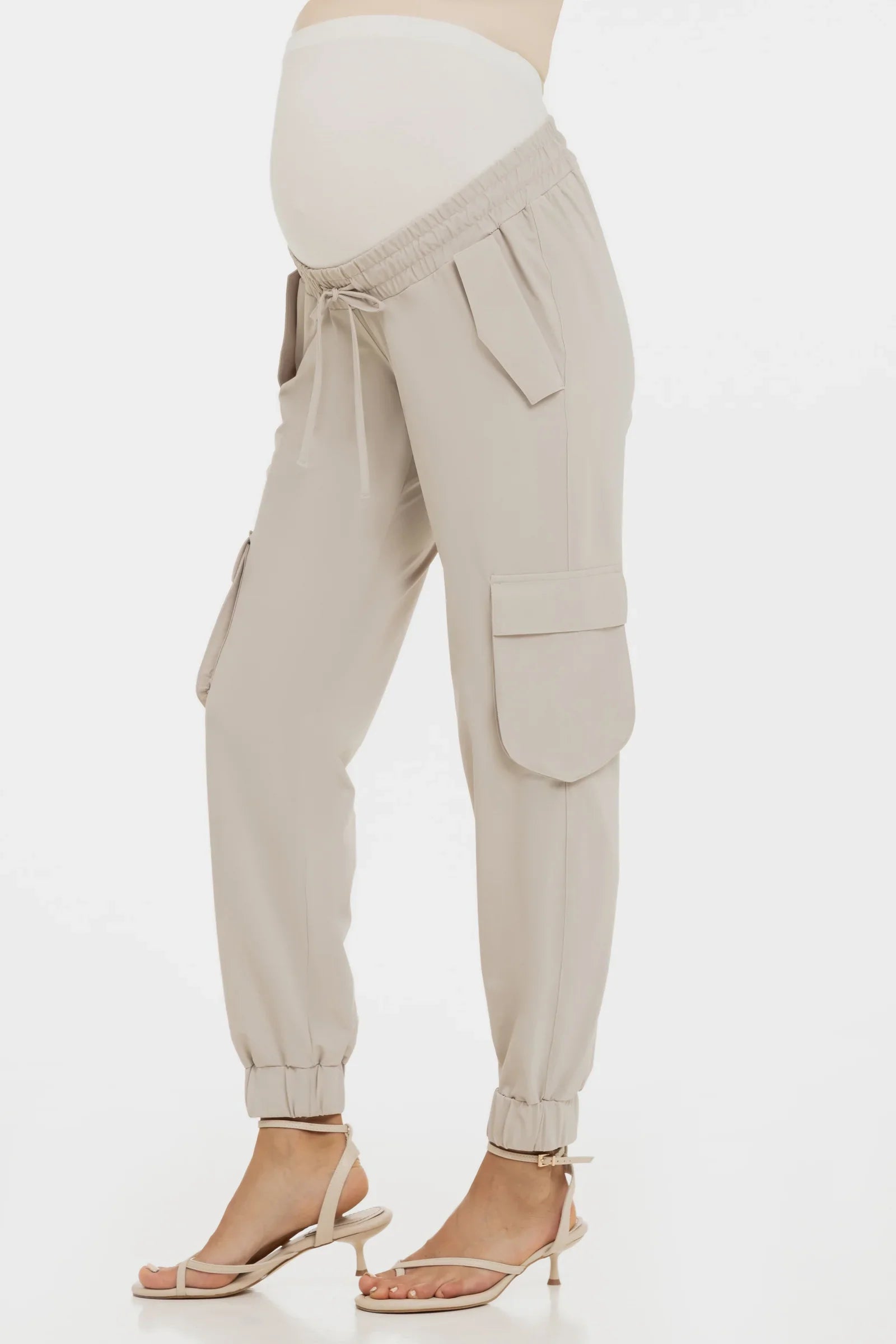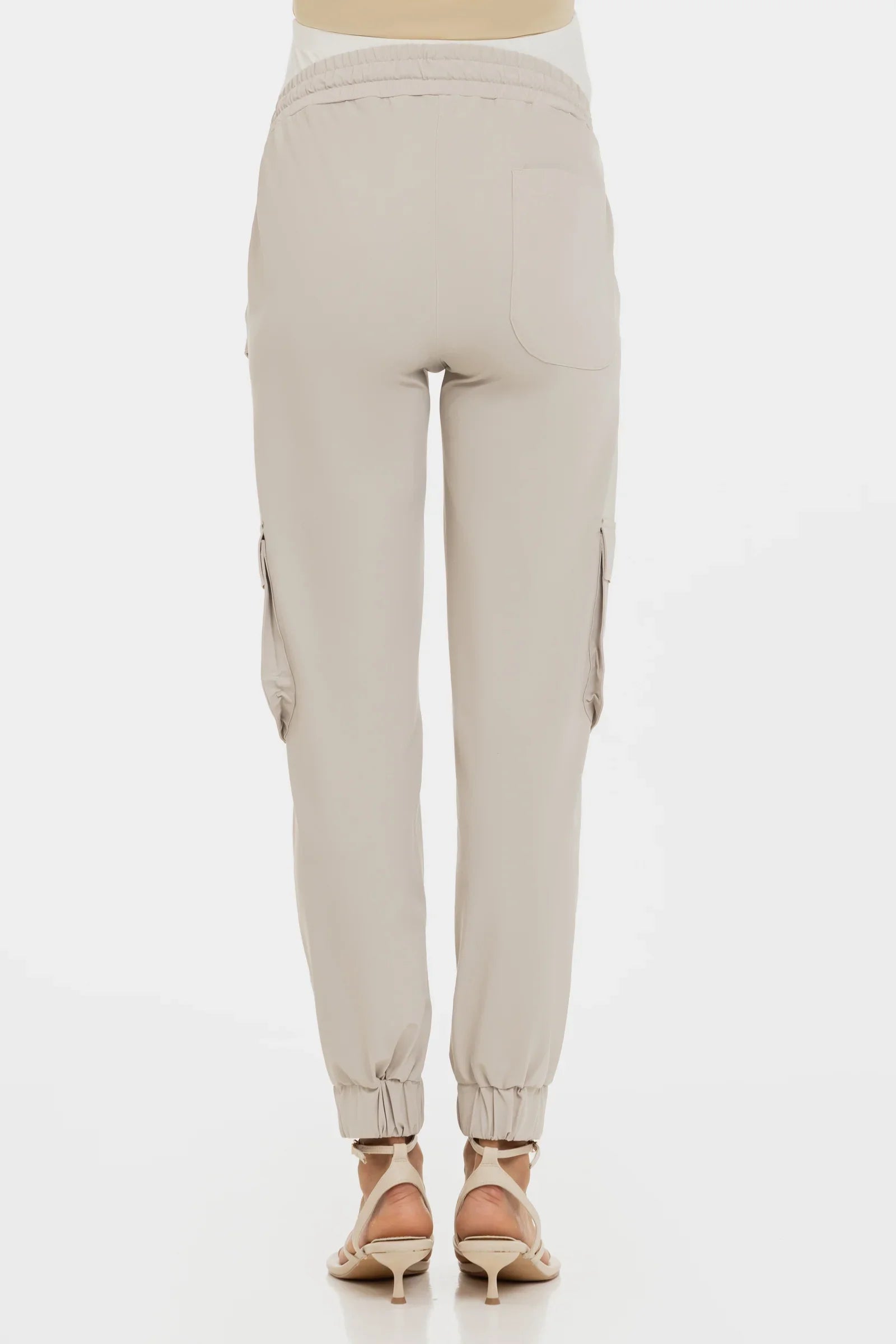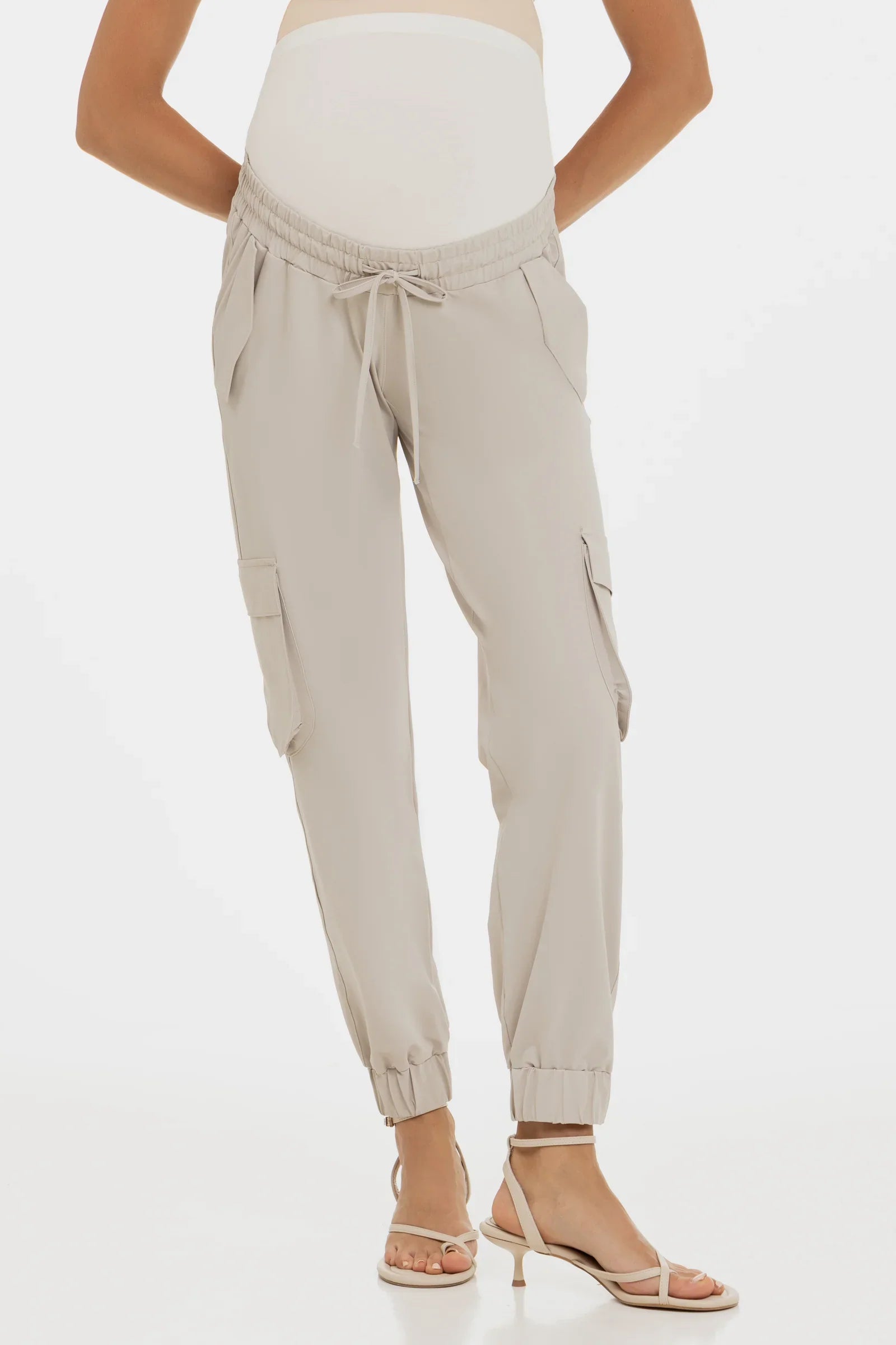 - Každodenní cargo kalhoty vyrobené z elastického žerzeje v béžové barvě