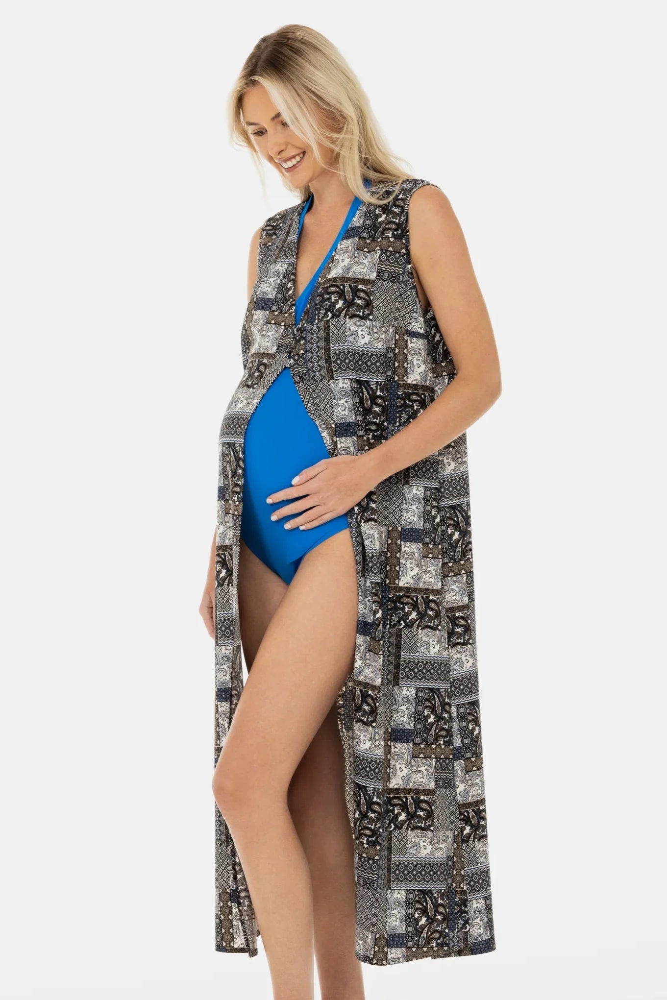 Tento vzdušný těhotenský kaftan jsme navrhli pro snadné kombinování – s plavkami, našimi kalhotami, topem nebo džínami – podle příležitosti. Ideální i na chladnější večery u moře.