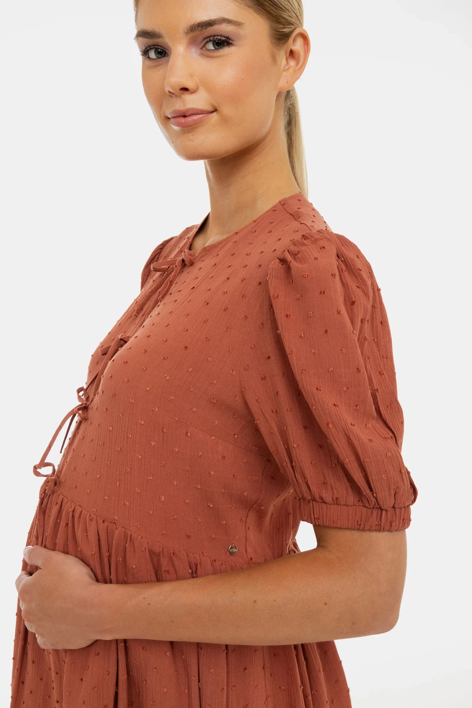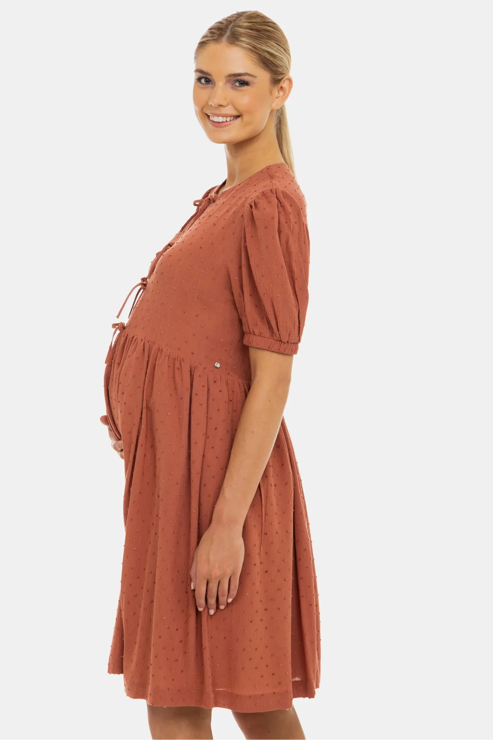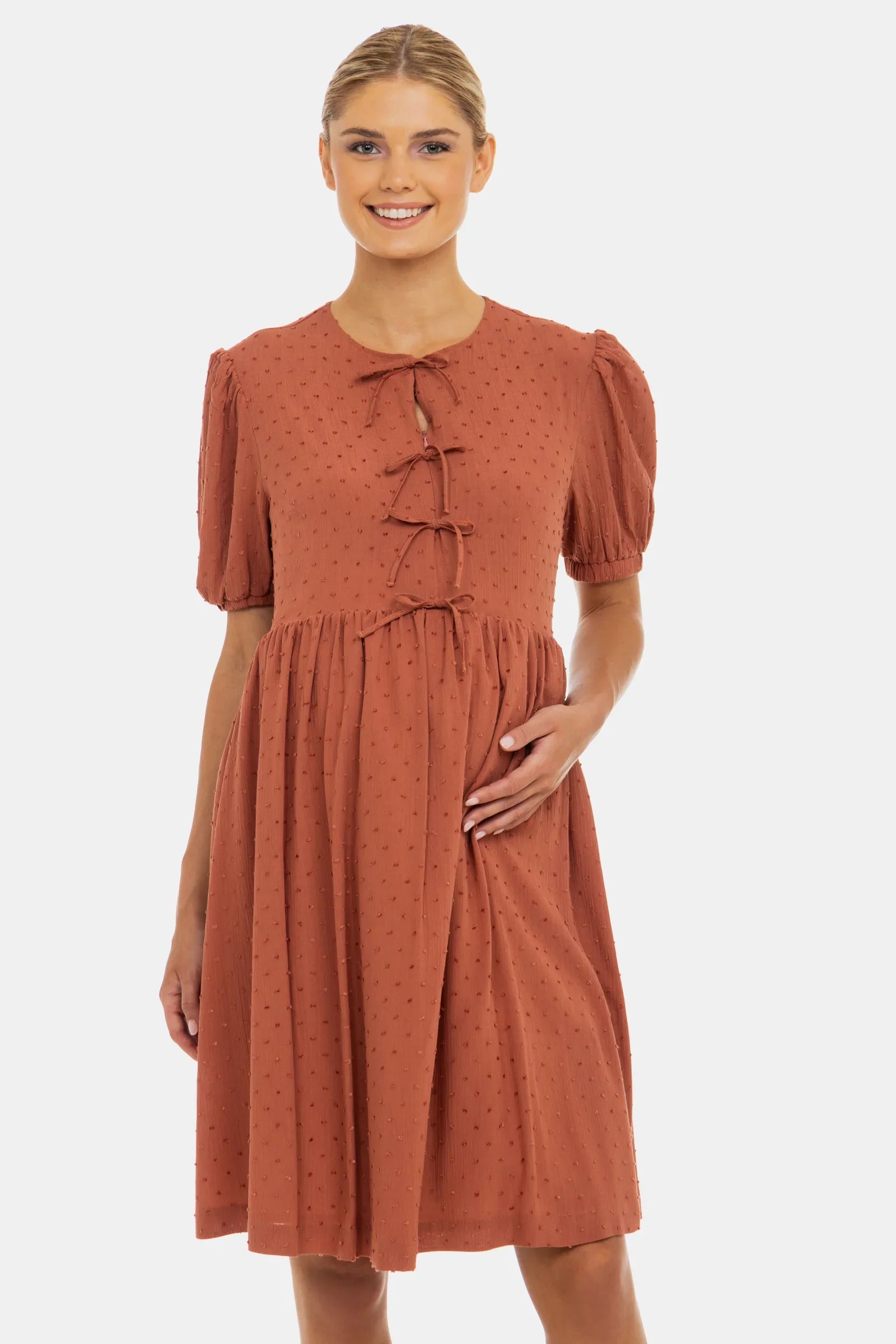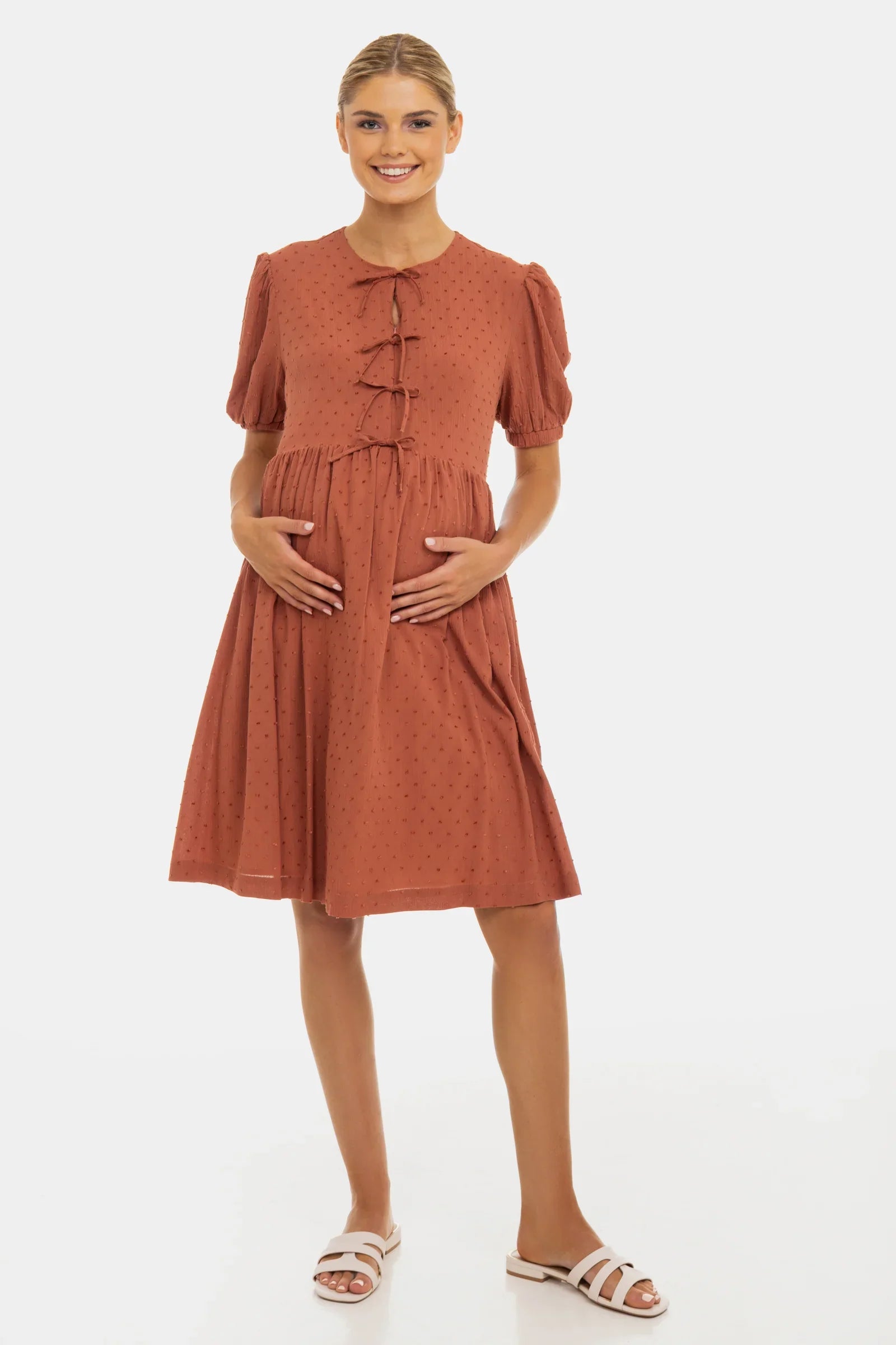 Těhotenské a kojicí šaty s objemnými rukávy, dekorativními mašlemi a skrytým zipem pro diskrétní kojení. Vyrobené z lehkého materiálu s vzdušným střihem – ideální pro teplé dny, bez kompromisů na pohodlí!