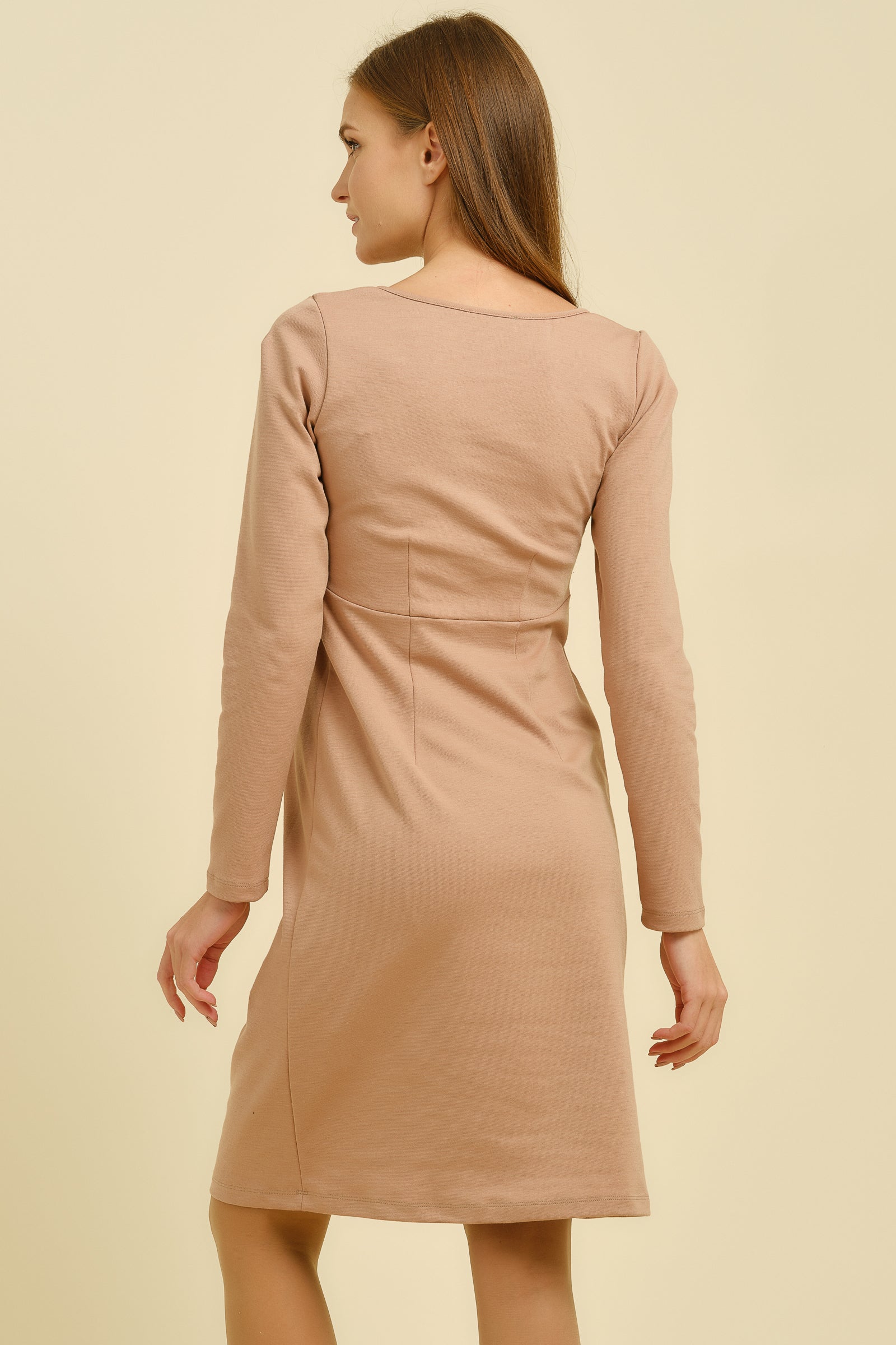 - Šaty jsou vyrobené ze silného žerzeje v pastelově béžové barvě