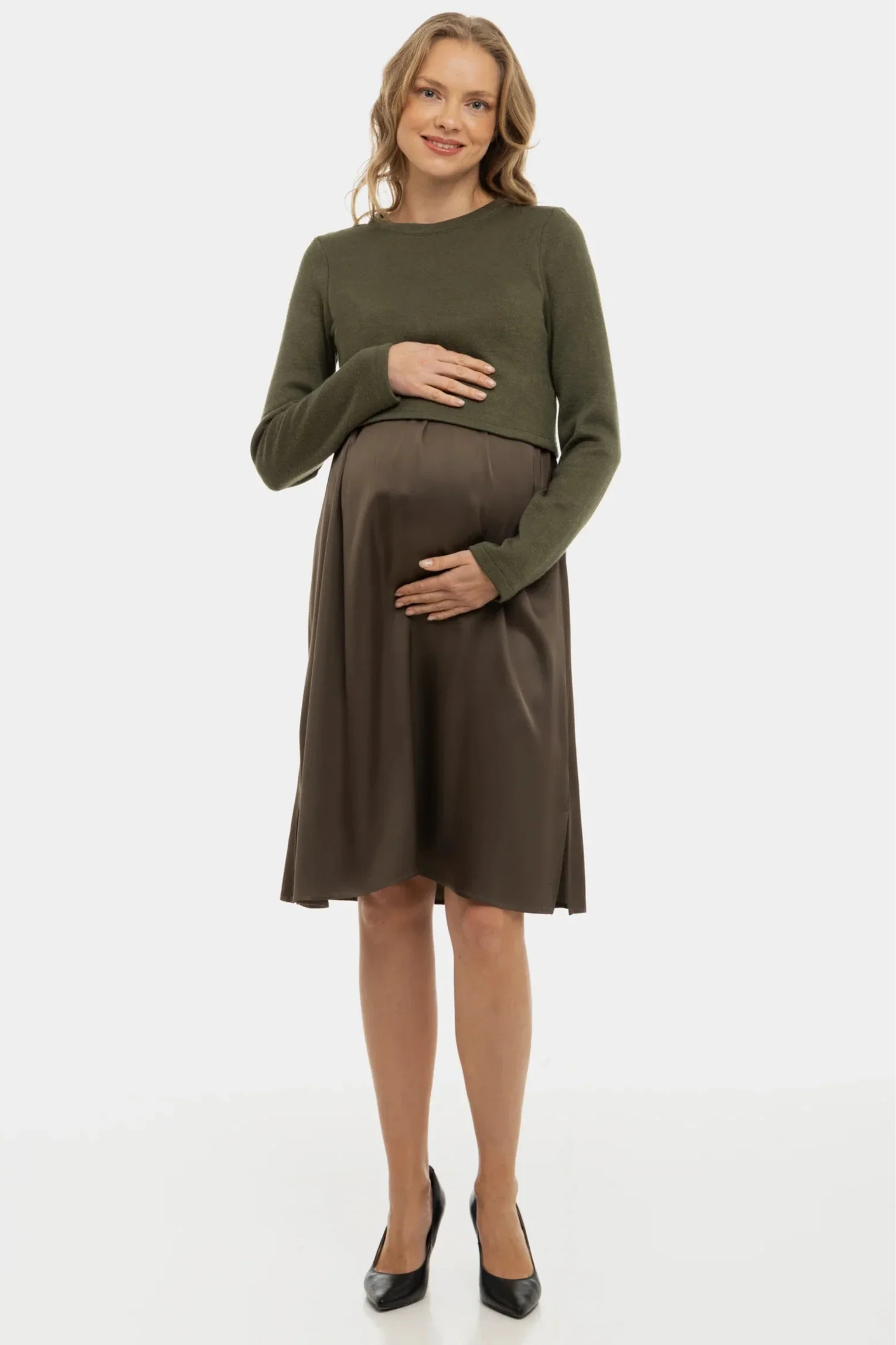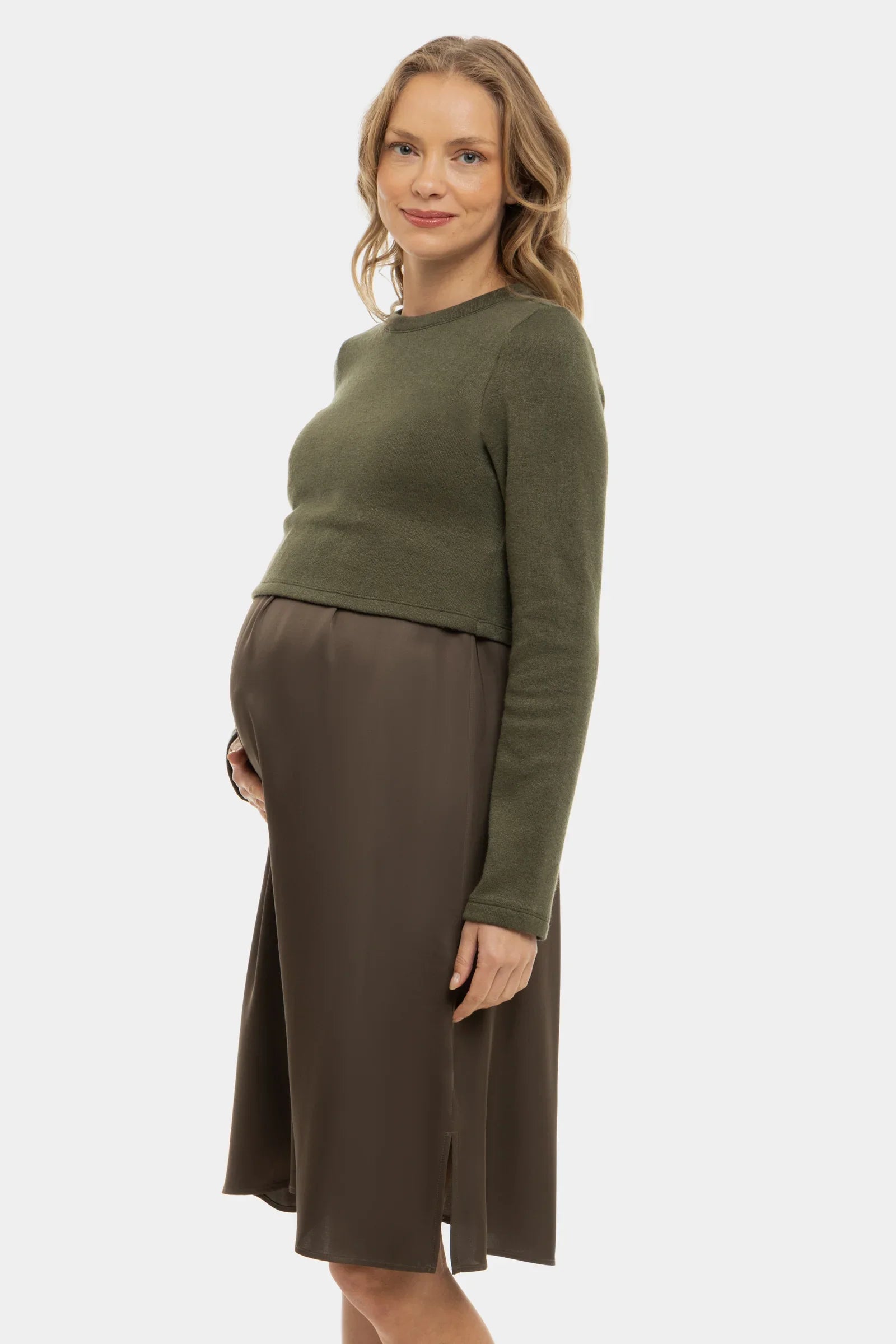 Tyto šaty jsou kombinací pohodlného svetru a elegantní saténové sukně, speciálně navržené tak, aby vám poskytly styl a pohodlí během těhotenství i po něm!