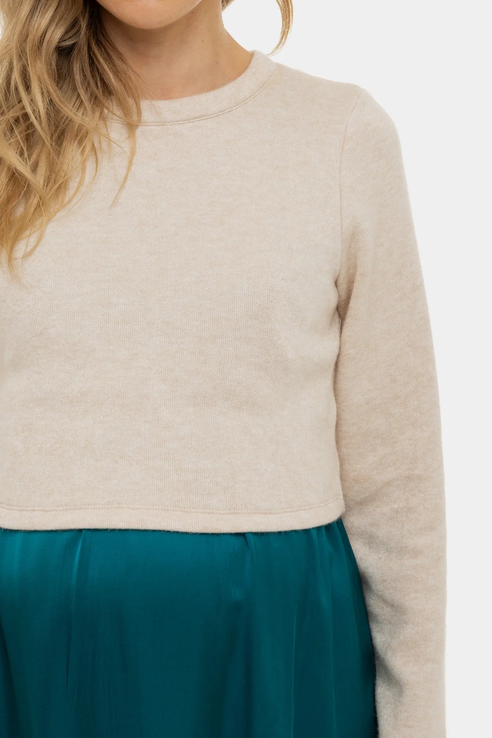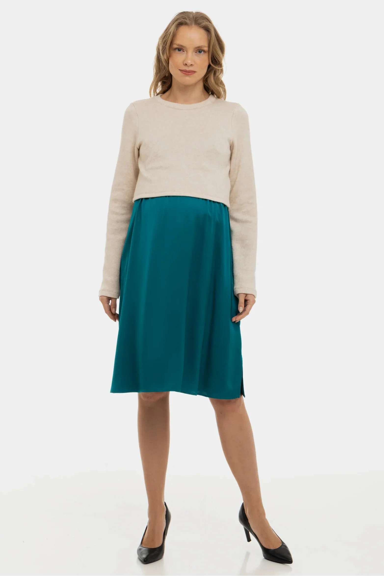 Tyto šaty jsou kombinací pohodlného svetru a elegantní saténové sukně, speciálně navržené tak, aby vám poskytly styl a pohodlí během těhotenství i po něm!