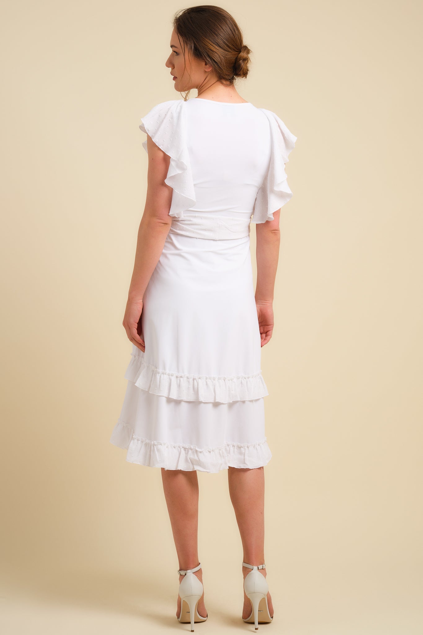 - Volánky v lemu a krátké motýlí rukávy s puntíkovým vzorem