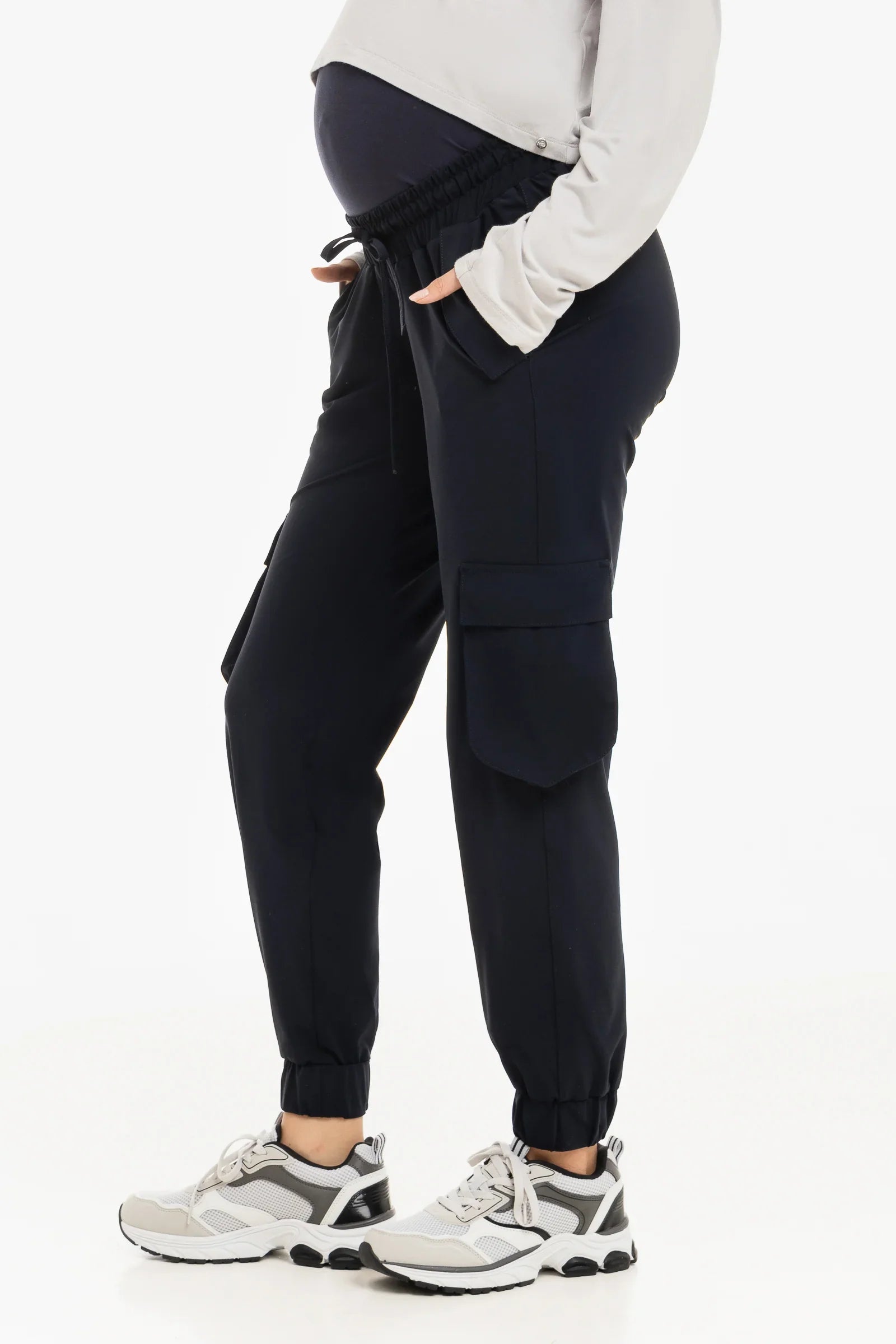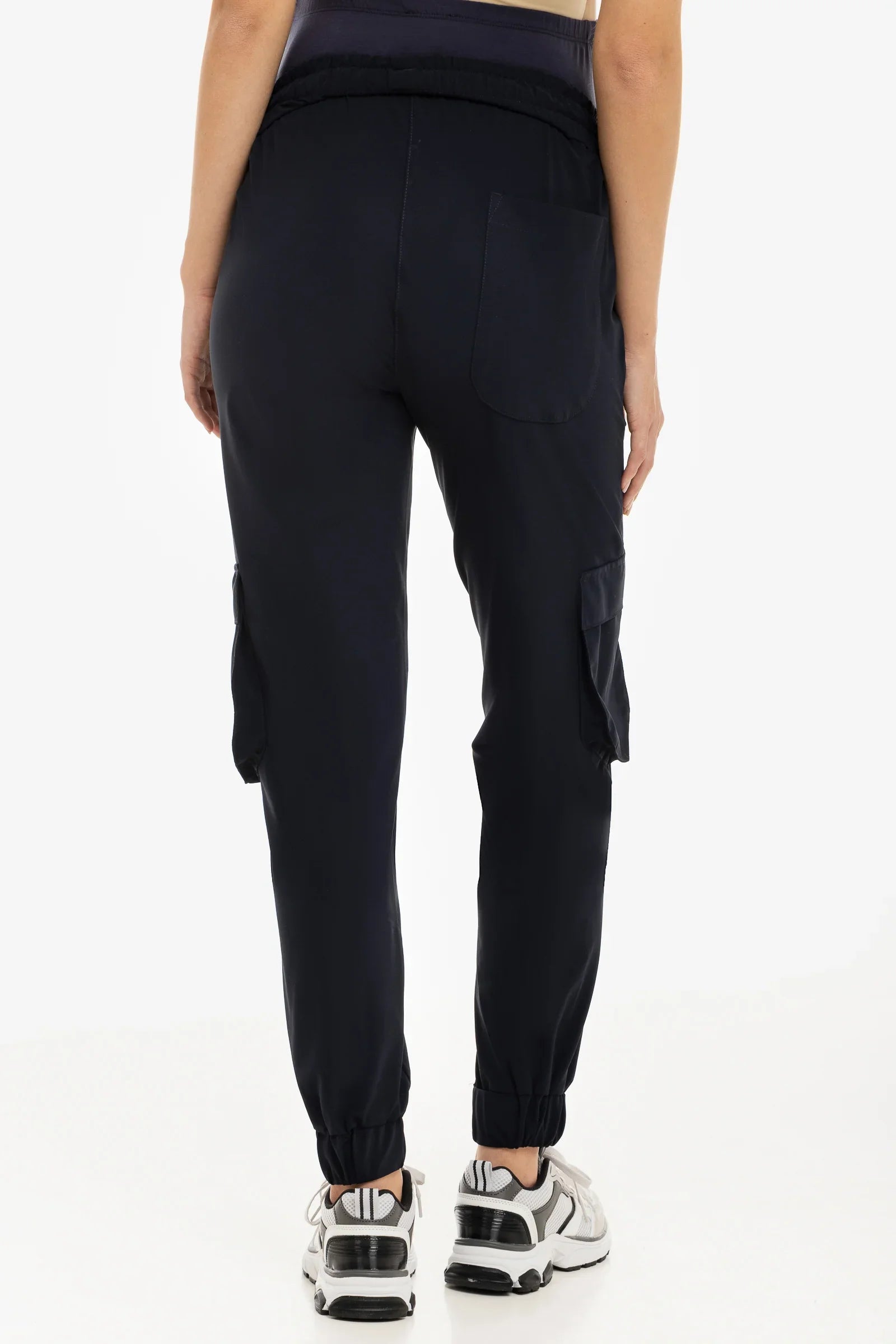 - Každodenní cargo kalhoty vyrobené z elastického žerzeje v tmavě modré