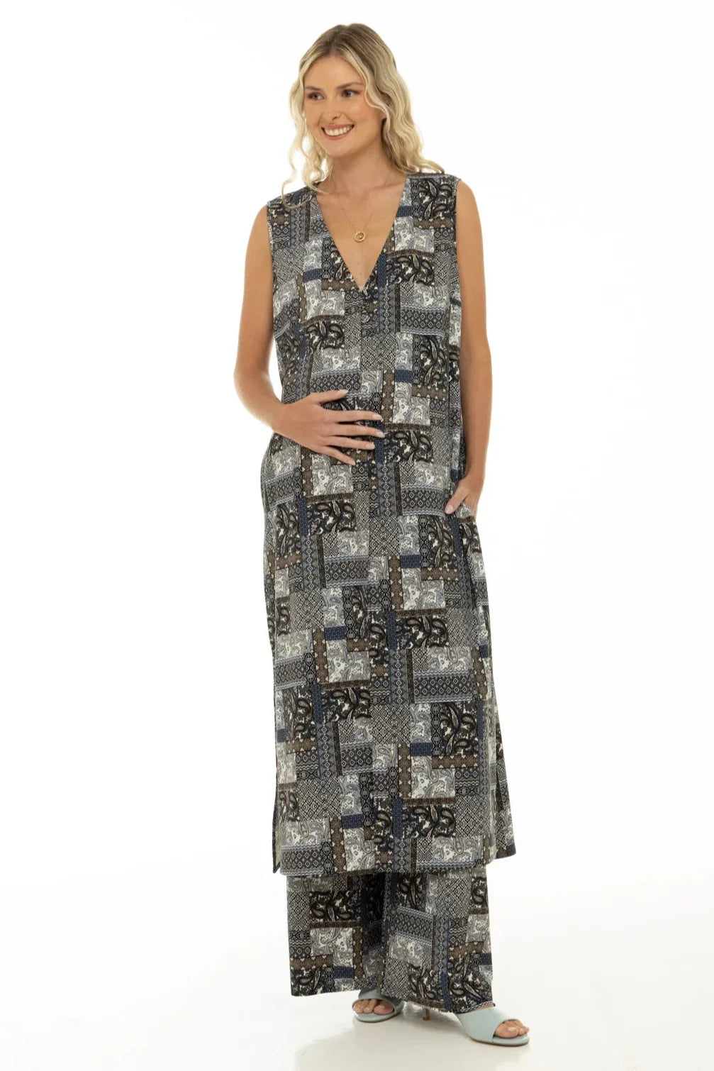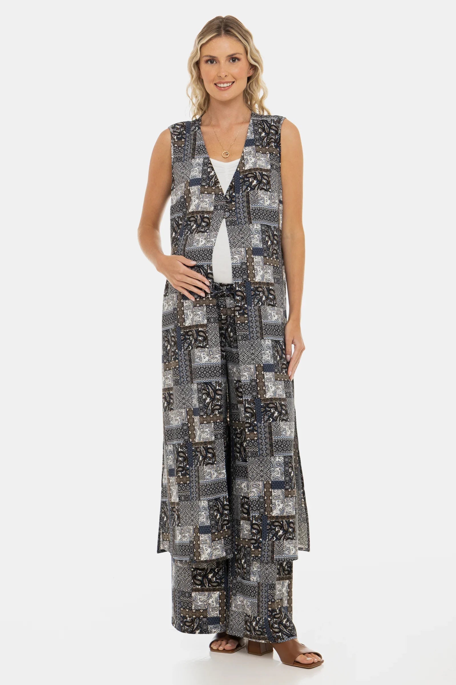 Tento vzdušný těhotenský kaftan jsme navrhli pro snadné kombinování – s plavkami, našimi kalhotami, topem nebo džínami – podle příležitosti. Ideální i na chladnější večery u moře.