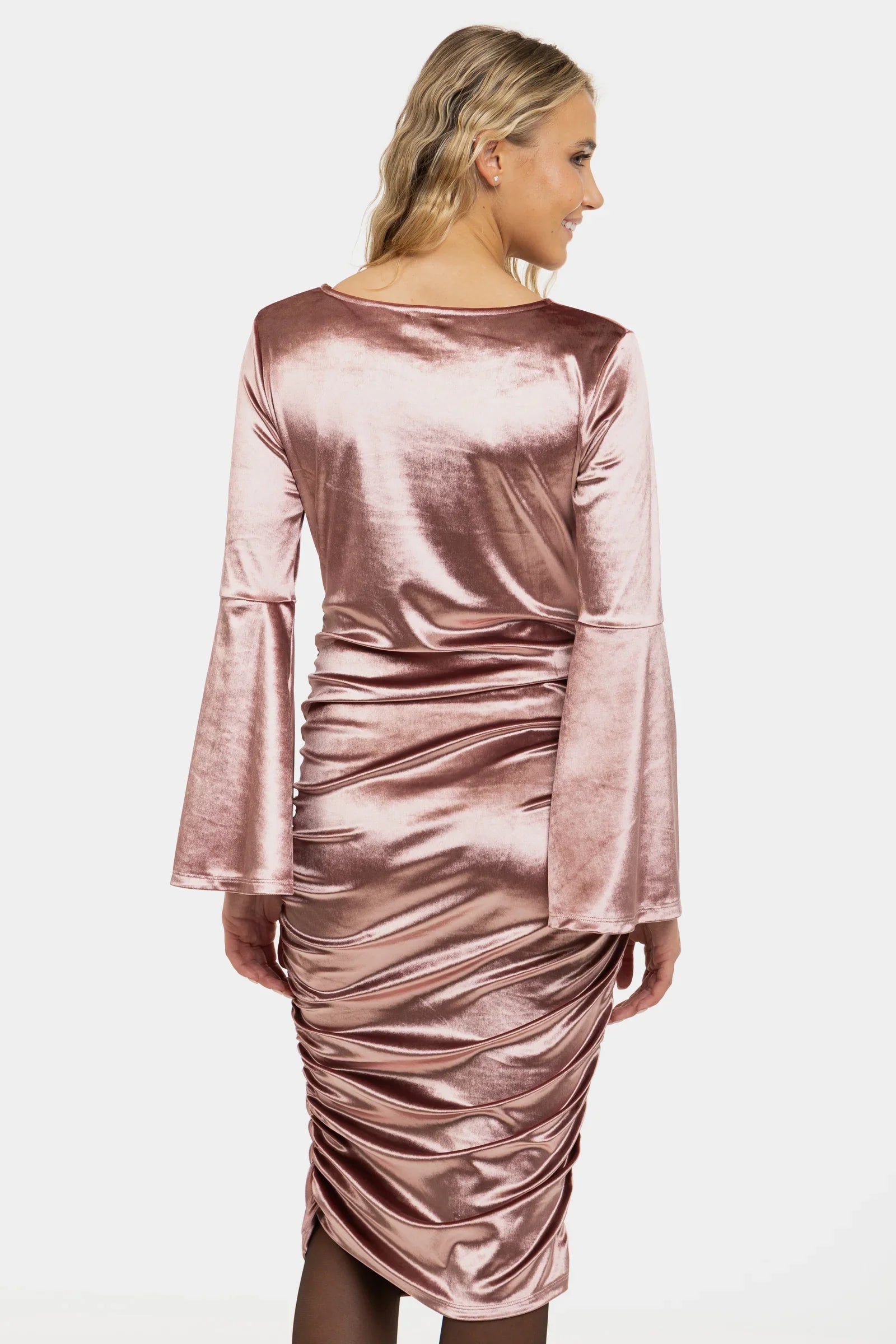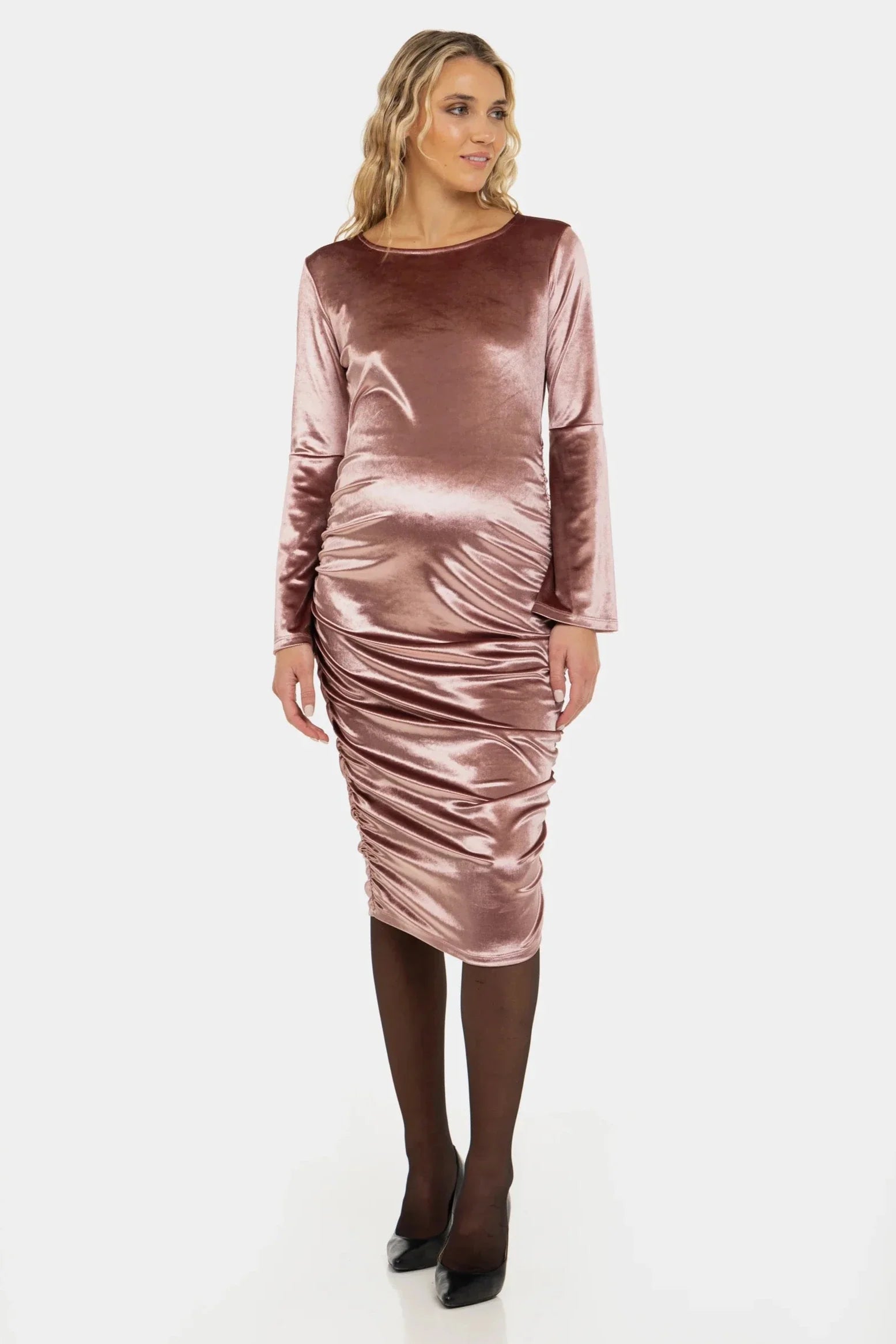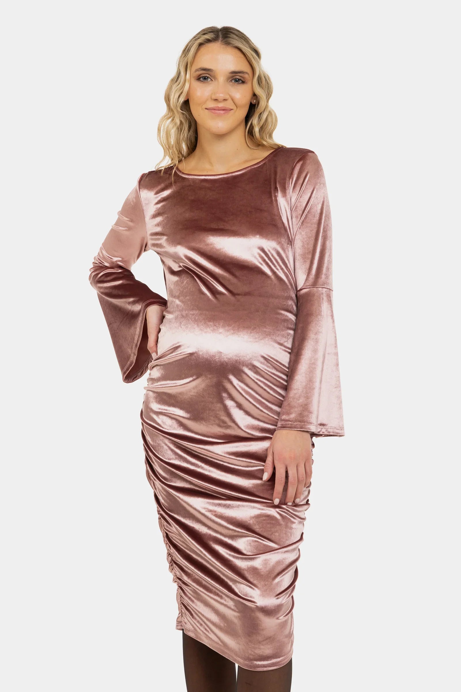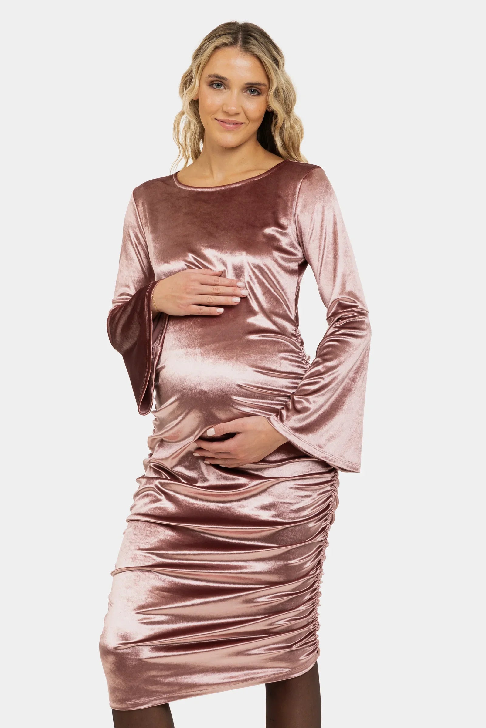 - Těhotenské šaty jsou vyrobené z lesklé sametové látky v práškové barvě