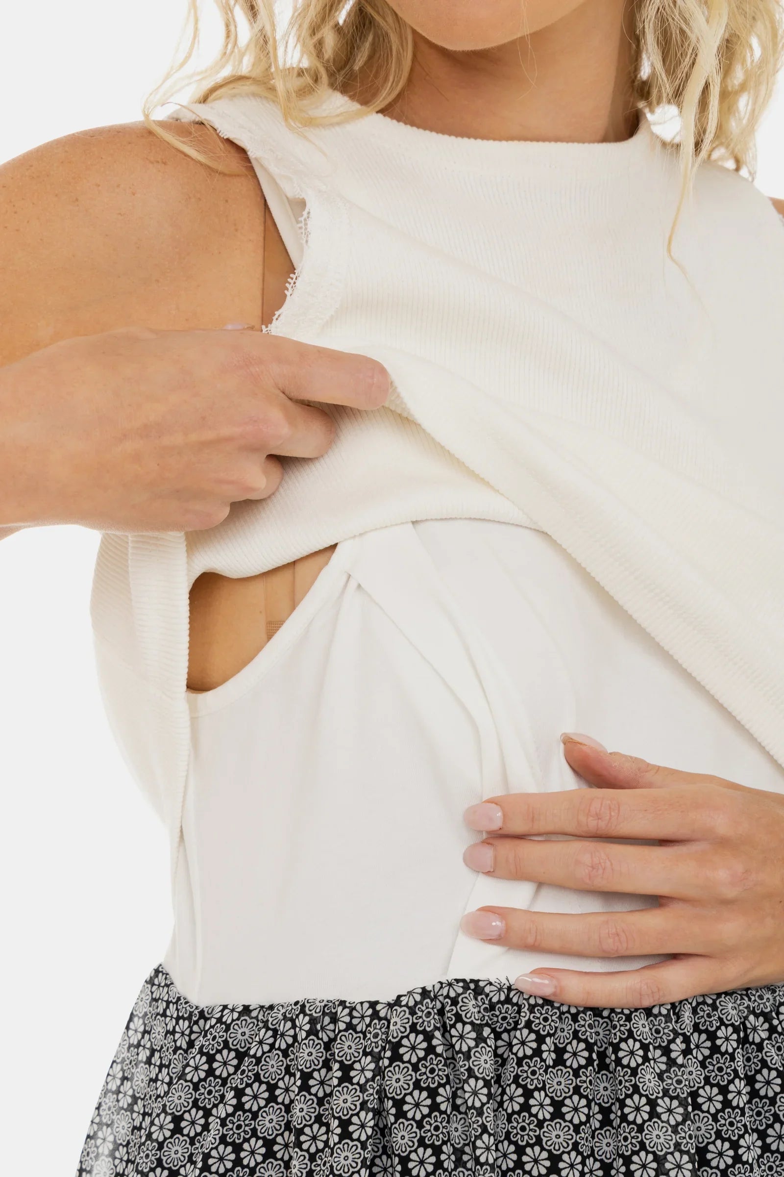 - Snadný přístup ke kojení: horní vrstva se zvedá, spodní vrstva má překřížený střih