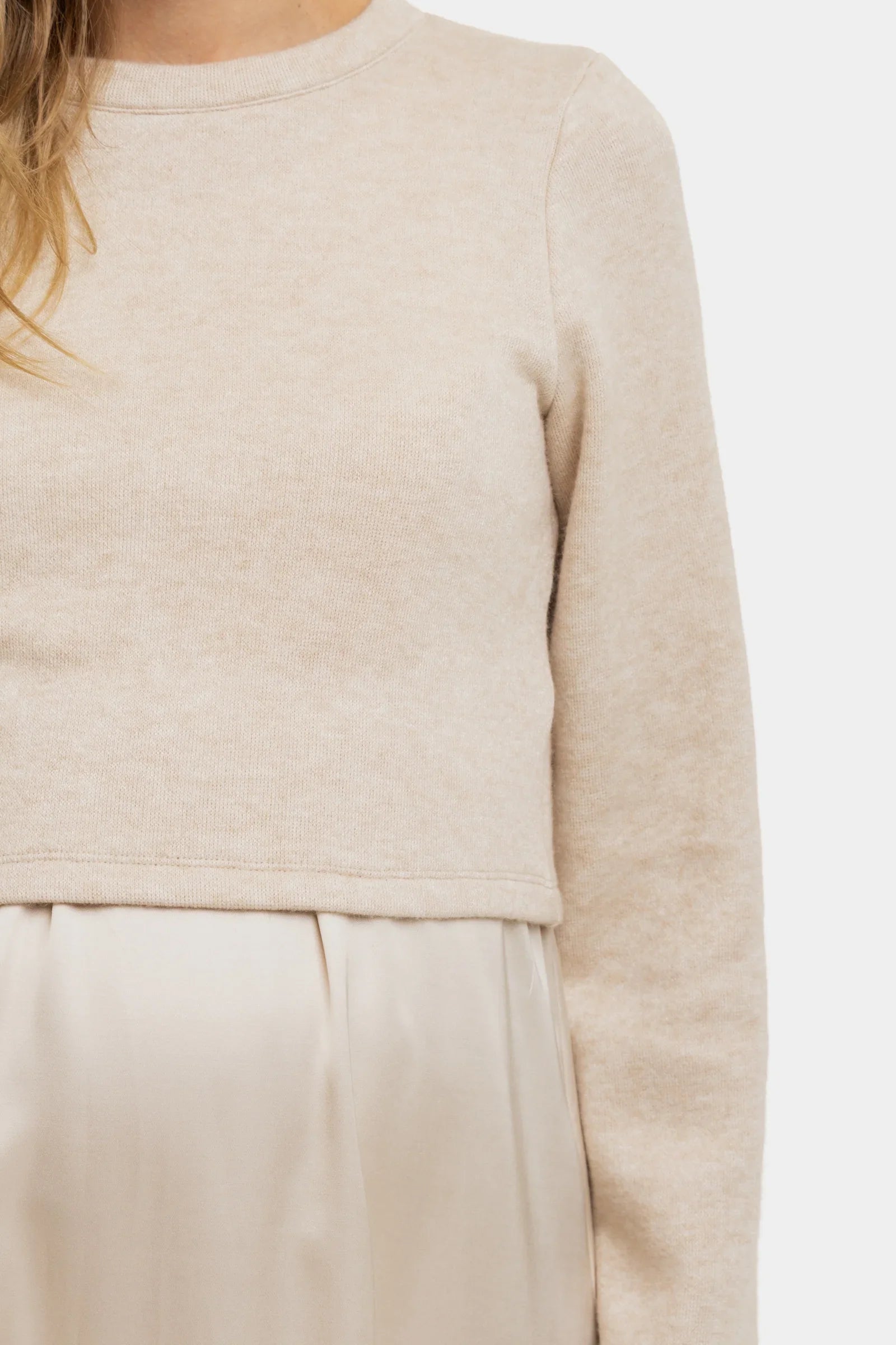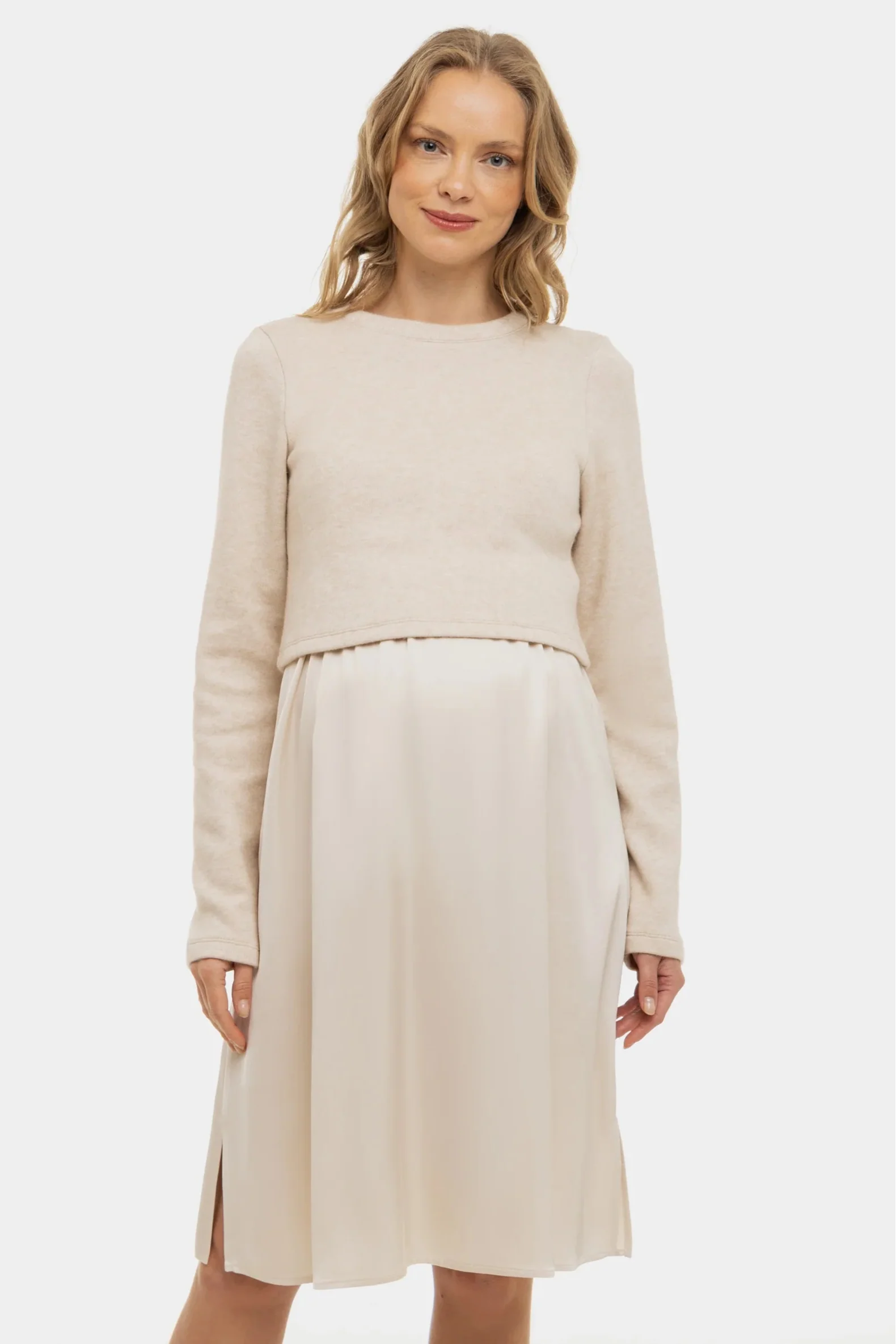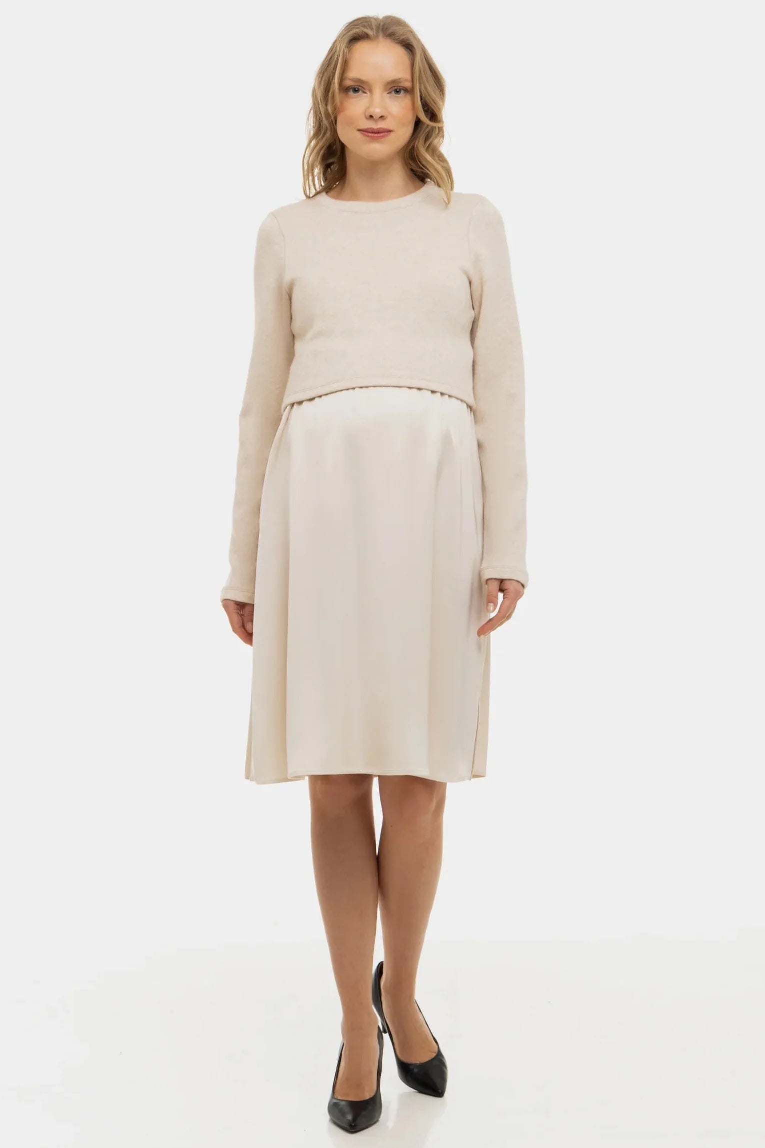 Tyto šaty spojují útulný svetřík a elegantní saténovou sukni a byly vytvořeny tak, aby ti poskytly styl i pohodlí během těhotenství – a klidně i dlouho poté!