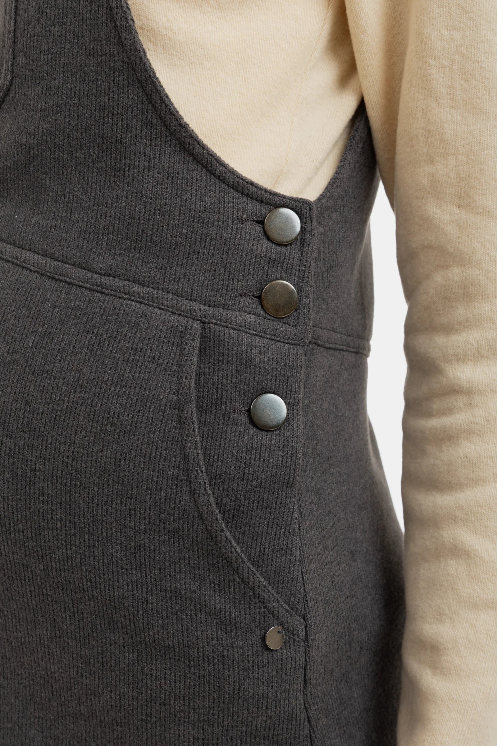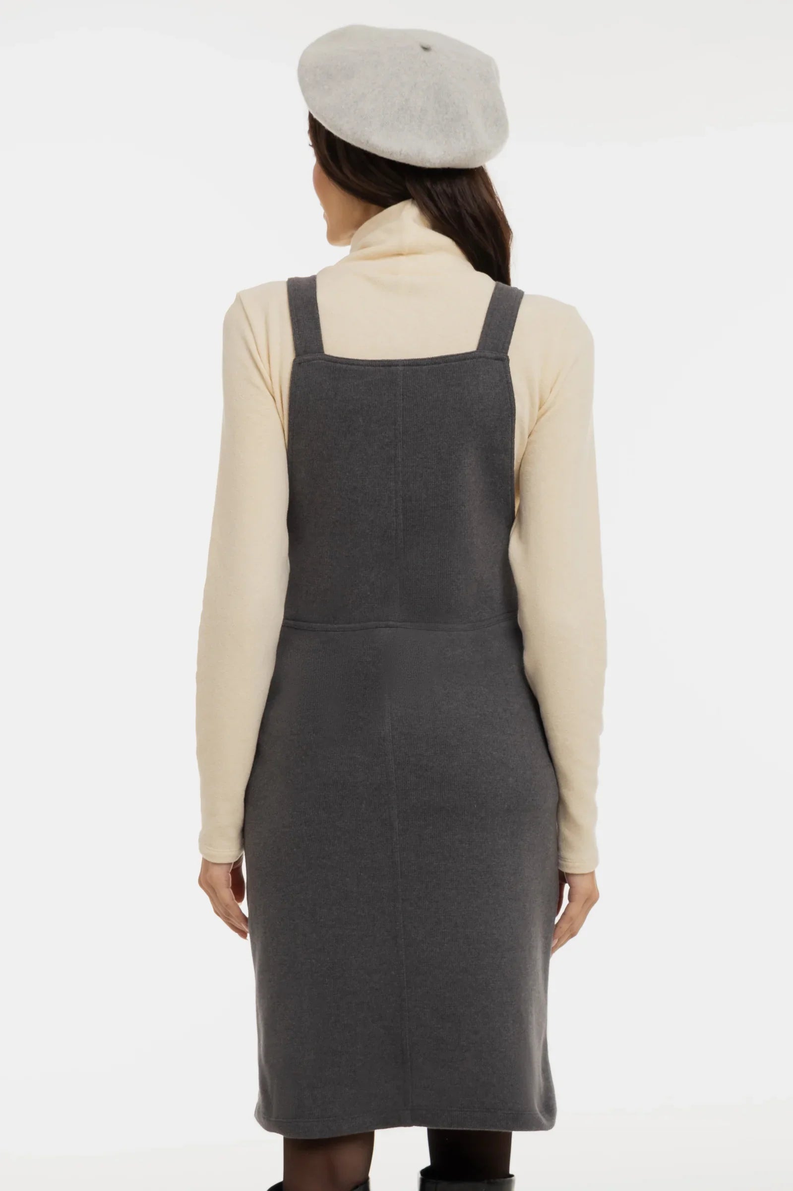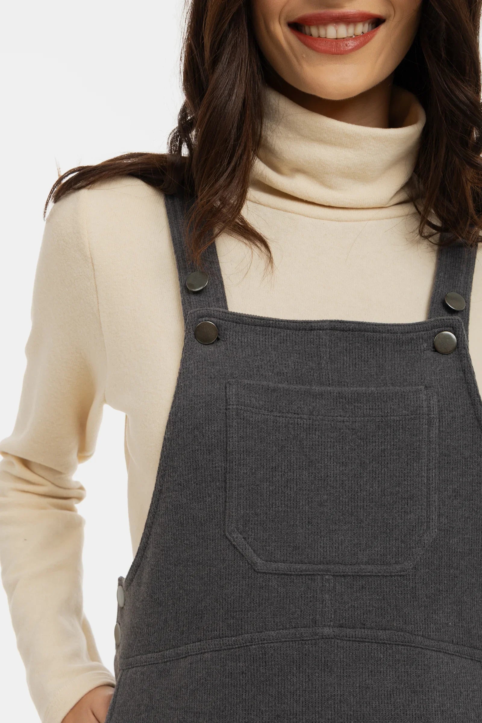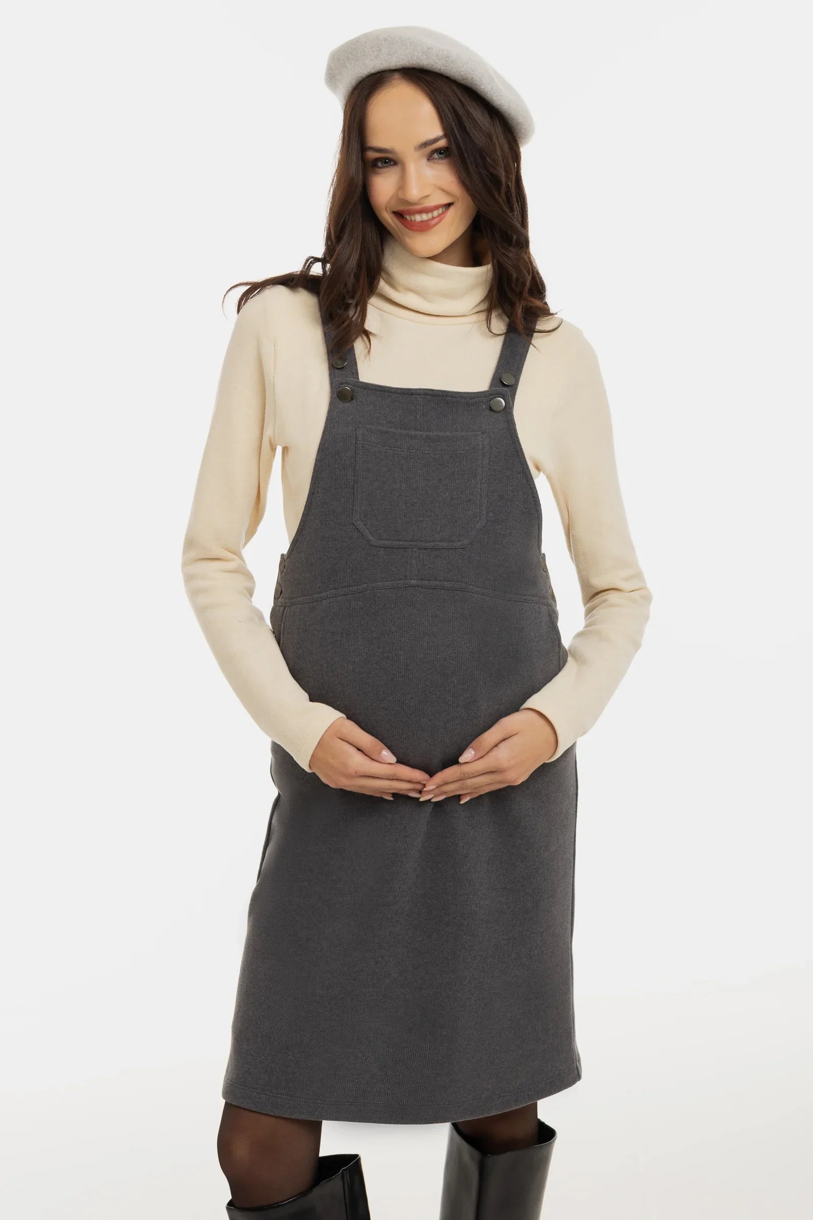 Pletené těhotenské šaty s laclem s jednoduchým střihem – snadno se kombinuje s klasickým rolákem nebo košilí.